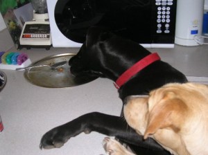 The other night, I came out of my office to find papers scattered all over the floor, giant claw marks in our new tablecloth, and Annie, the blonde, sitting on the big chair, with potholders and napkins spread out before her like a banquet. After screaming at the dogs, I hollered at the husband about how he should have been watching “the kids.” He got mad and closed himself up in his office.