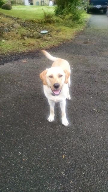 Meanwhile, there’s Harley. I have written about Harley, the yellow Lab across the street, before. Now he’s a little over a year old, 100 pounds, and so massive he makes my 70-pound Annie look small. He still galumphs and spins in circles and chews on anything he can find. He spends most of his days in the yard, unattended, with only an electric fence to hold him. He gets a shock through an attachment on his collar when he crosses the line. But when I come outside, he runs right through his fence. I hurry over to pet and hug him and lead him back to his own yard. I admit that sometimes I go out just to get a Harley hug. He’s always there. When I go out in my car, the last thing I see is Harley standing in the street looking sad because I’m leaving.