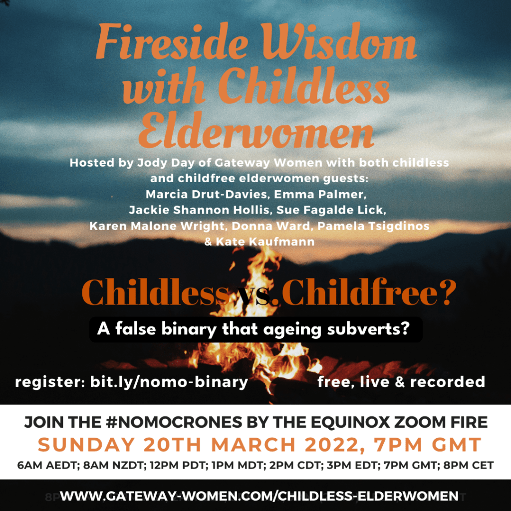 The “Nomo Crones” are meeting again. This international group of childless elderwomen led by Gateway Women’s Jody Day will meet via Zoom on Sunday to talk about being childless vs. childfree. It’s a subject we discussed here in January, but there’s so much more to say. For those of us who are childless by marriage, I think the line between choice and non-choice is always a little hazy. If we had chosen another partner, we might not be childless. Register at bit.ly/nomo-binary, and tune in at whatever time fits your zone. It’s noon Oregon time, 8 p.m. in the UK. I would love to “see” you there. You will not be on camera, so don’t worry about blowing your anonymity, if that’s a concern. You will be able to talk to us in the “chat.” Join us, and let us know what you think. If you’re not a “crone” yet, even better. We need to hear from all ages.