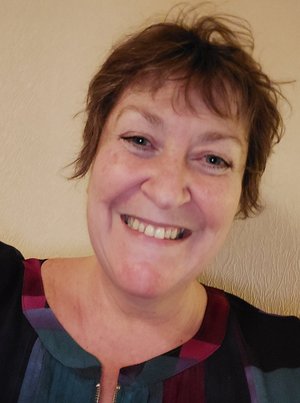 Picture of Stephanie Joy Phillips, multi-colored dress, short red hair, big smile