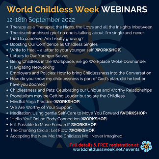 Next week is World Childless Week. Founder Stephanie Joy Phillips offers seven days of webinars, workshops, and access to resources for those of us who are childless not by choice. Some of the sessions focus on those who have struggled with infertility. If that is not your issue, you might want to skip those, but there is still a lot to be gleaned from these free online sessions. See the poster below for a list and register for the sessions that interest you. They will be recorded, so if you can’t make it at the time they’re aired live, sign up anyway. Many of the speakers are in the UK and their time is many hours different for people like me on the U.S. west coast.